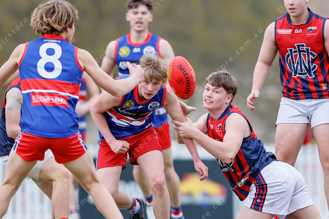 Barossa District’s Jake Hall gets the handball away despite Nickolas Watts hanging from his arm. (495290_01)