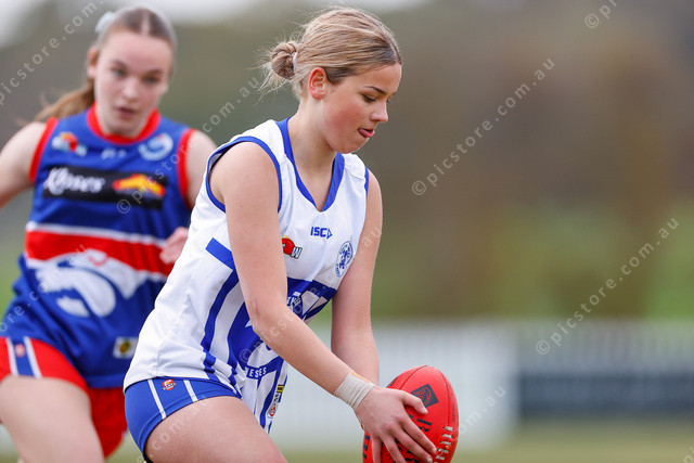 South Gawler’s Charlee Rothe tries to quickly get a kick away before the chasing tackler arrives. (495663_02)