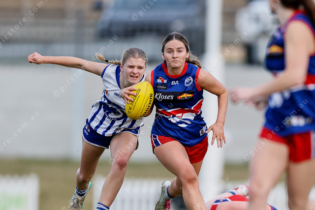 Ellie Ward sprints through the middle of Barossa Park with South Gawler’s Anya Jackson in hot pursuit. (Mark Willoughby: 495663_09)