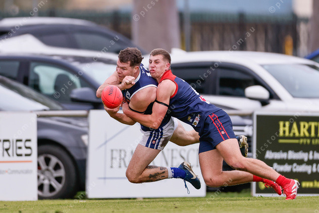 Gun Angaston midfielder Tom Corcoran is wrapped up in a terrific tackle by Thomas Downie. (496717_01)