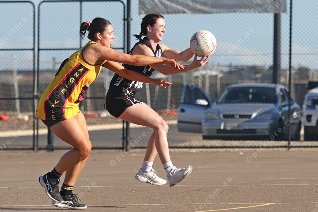 Mallala’s Ashlee Angus receives a pass on the move in front of Jordis Gordon. (498453_01)