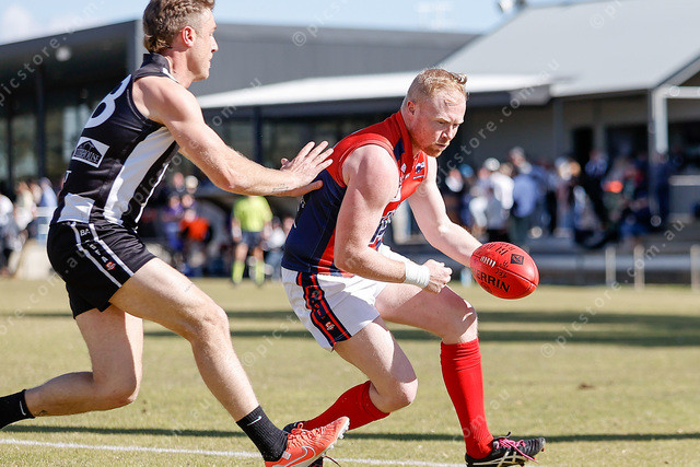 Ash Fry tries to escape after being corralled near the sideline by Tanunda’s player-coach Sam Colquhoun. (498232_02)