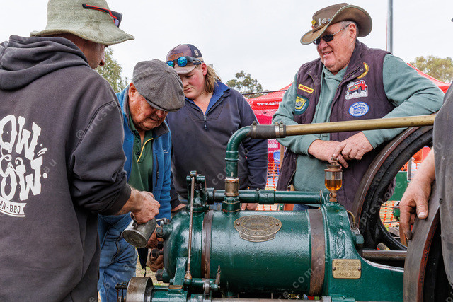 Tim, Roger, Lachlan and Colin work on one of the old engines on display at the Gawler Machinery Restoration Club. (498215_09)