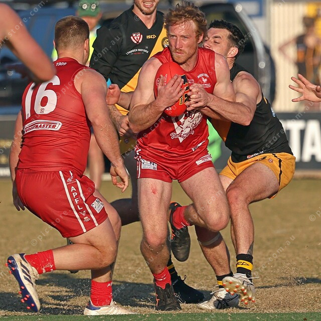 Ned Seccafien calmly looks for an option while being tackled by Jake Houston. (493940_10)