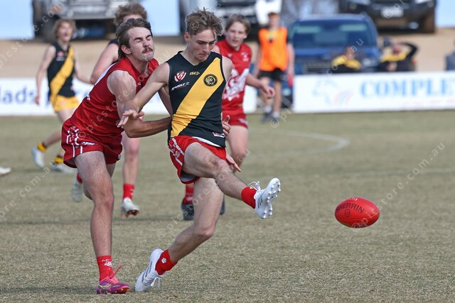 Michael Barber gets a kick away as the chase from Alex Pool arrives. (493934_04)