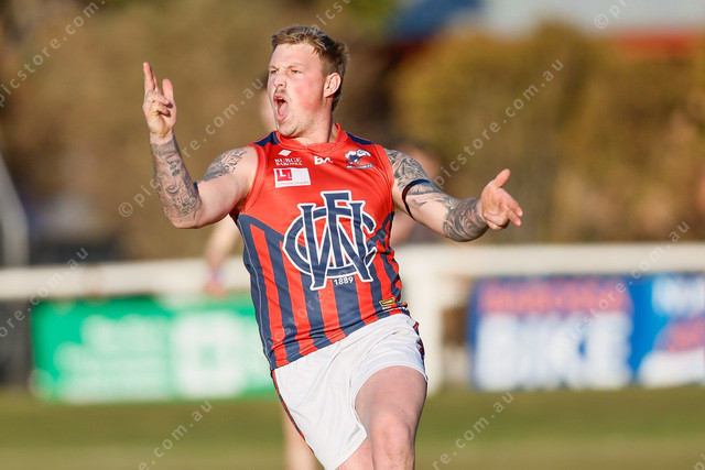 Donnybrooks standout full forward Nicholas Lehmann pulls out the finger guns to celebrate his five-goal haul. (Mark Willoughby: 494072_07)