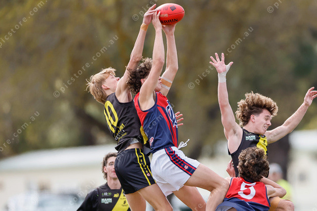 Willaston’s Charlie Moss takes a contested mark with Lucas Prior attempting to spoil. (493921_03)