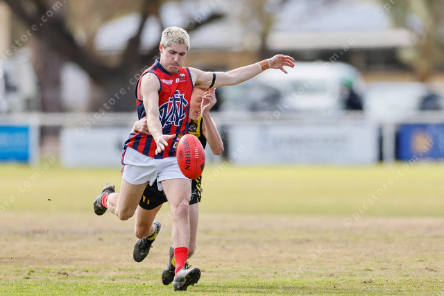 Willaston’s best-on-ground Ethan Siddall kicks as Lucas Prior lunges to make a tackle. (493921_07)
