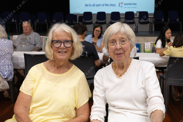 Ann Lord catches up with Josephine Olsen at the Australia Day breakfast at Nautilus Theatre. (Mitchell Paterson: 530577_08)