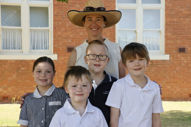 Cavendish Principle, Kate Steele with students Eleanor Hinkley, 7, William Hamilton, 8, Clem Hinkley, 5 and Mark Kelsall, 7 all from Cavendish ready for the raising of the Australian Flag.