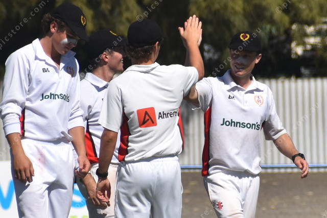 Kapunda’s Tom Harslett is congratulated by his teammates after taking the catch to dismiss Matthew Knight. (458381)