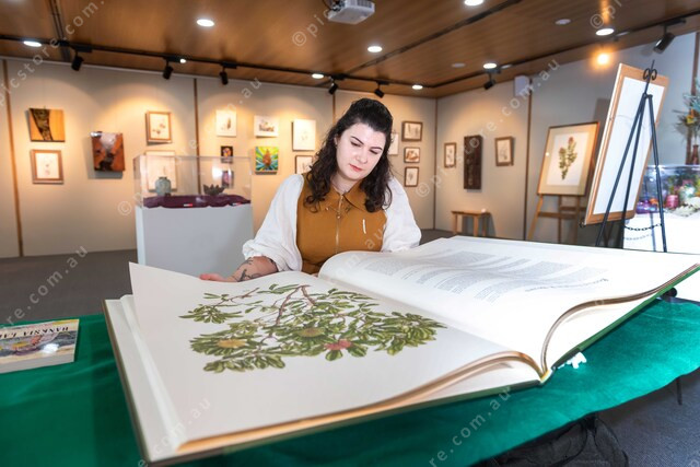 Claire Vaganiance (Curator and Artist 0466 542 299) with an Original Edition of work by Celia Rosser OAM (Australian botanical illustrator, Famous for this three volume “The Banksias”). A set was presented to Queen Elizabeth II. 492087_01