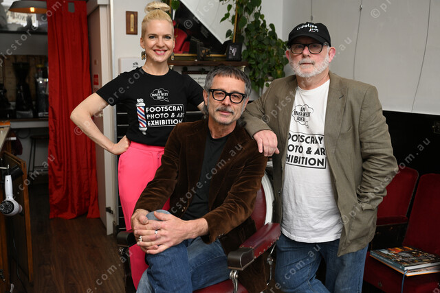 The Footscray Photo & Art Exhibition features three local artists at at Toni The Barber. Pic of artist Lady Mohawk, barber Toni Gedjo and photographer Jim Kellam. (Damjan Janevski). 512814_02
