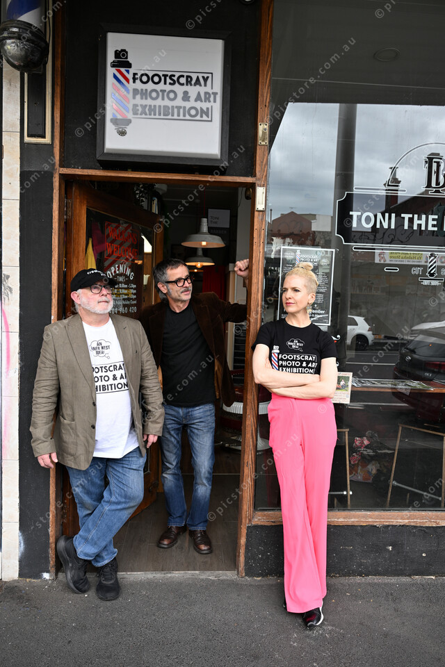 The Footscray Photo & Art Exhibition features three local artists at at Toni The Barber. Pic of photographer Jim Kellam, barber Toni Gedjo and artist Lady Mohawk. (Damjan Janevski). 512814_06