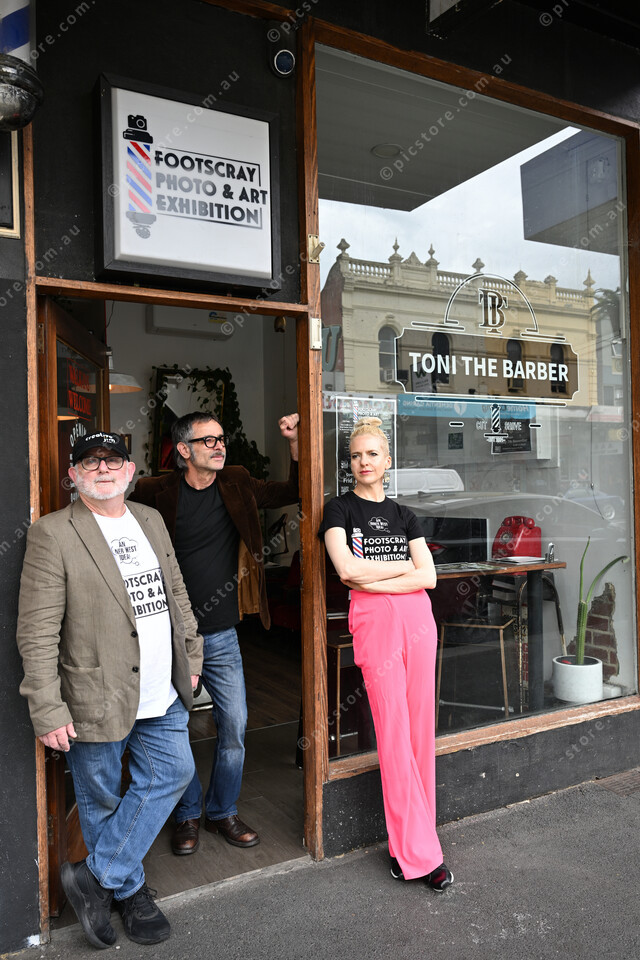 The Footscray Photo & Art Exhibition features three local artists at at Toni The Barber. Pic of photographer Jim Kellam, barber Toni Gedjo and artist Lady Mohawk. (Damjan Janevski). 512814_07
