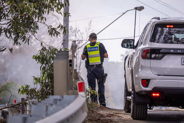 A police officer wearing a mask due to toxic fumes from a Lithium-Ion battery overlooks the scene. Police had the roads cordoned off.