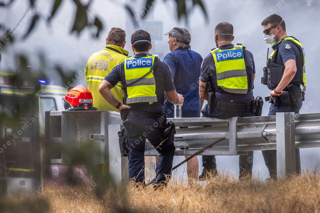 Police and Firefighters discuss the situation. A lot of roads were cordoned and this was as close as I was allowed. Plus shooting through the trees.