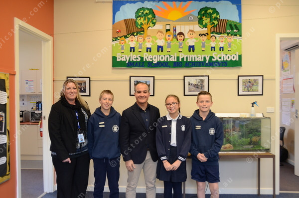 Education Minister James Merlino (centre) announces a new $400,000 for Bayles Regional Primary School. He is pictured with Grade 6 teacher Alison Andrews and school captains Travis, Shannon and Cooper. 172660_01 Picture: BONNY BURROWS