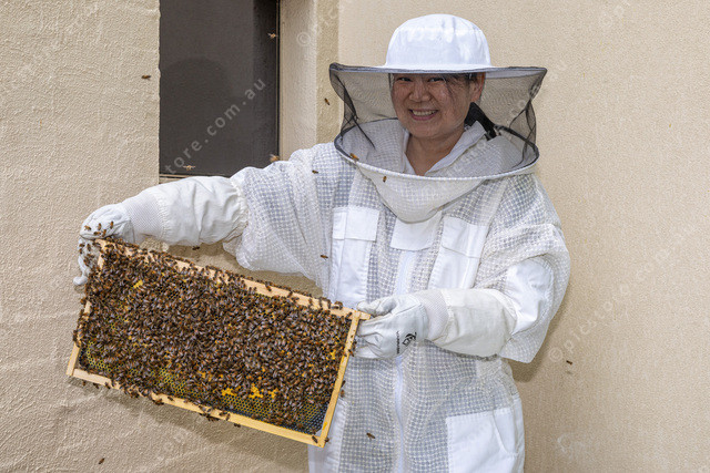 Alice Lin in her beekeeping outfit attending her apiaries.