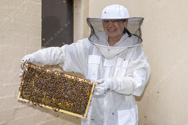 Alice Lin in her beekeeping outfit attending her apiaries.