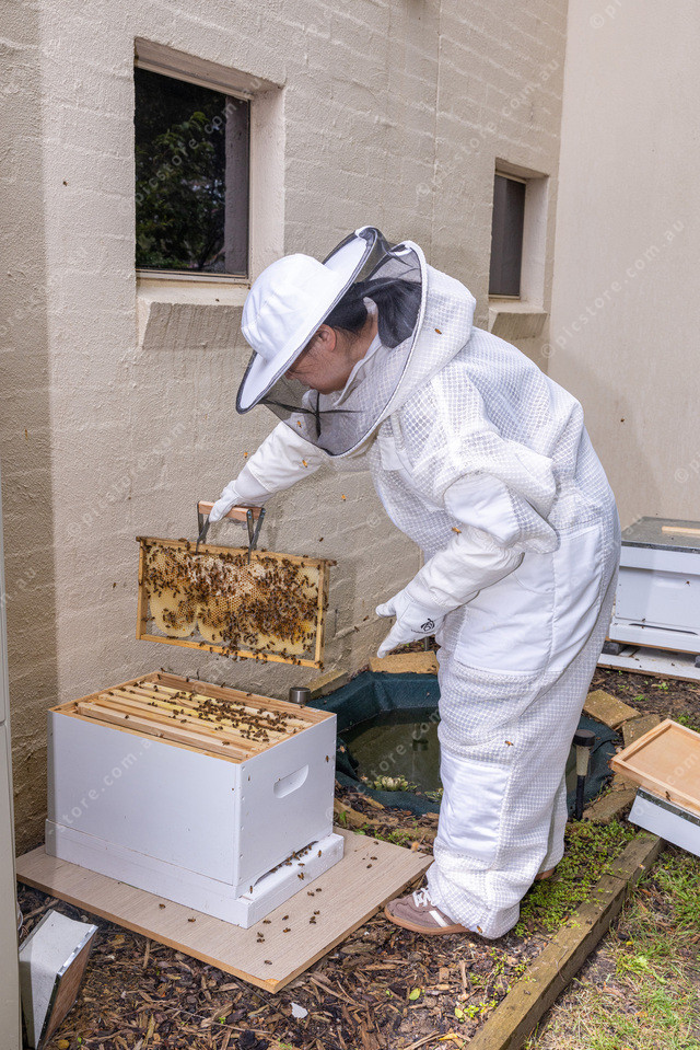 Alice Lin in her beekeeping outfit attending her apiaries.