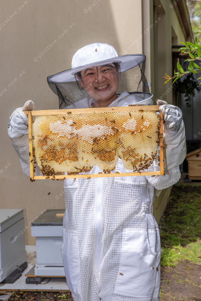 Alice Lin in her beekeeping outfit attending her apiaries.