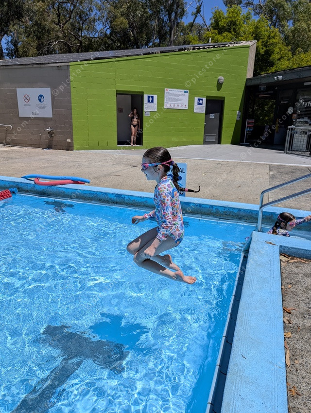 Zoe jumps into the pool. (453671)