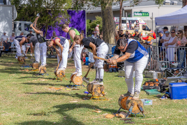 The closest chopper is Adele Deverell from Kilmore, she is wearing a Victorian top.