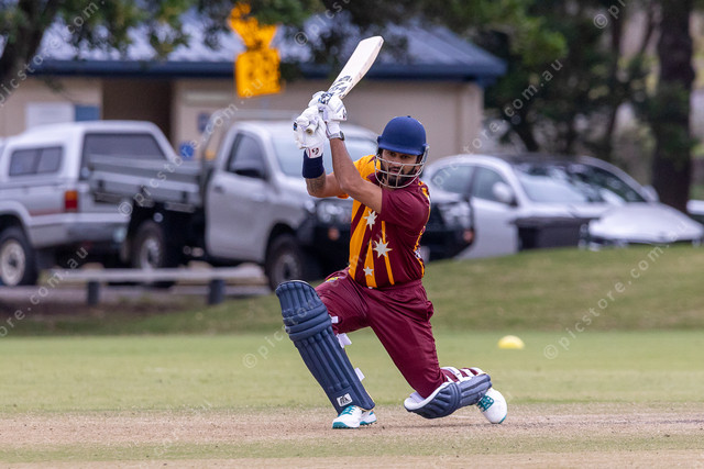 Former Sri Lankan captain Dimuth Karunaratne padding up in Gympie.