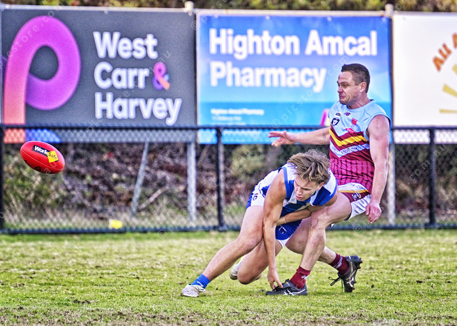 Jack Duke kicks the ball through the goals but is freekicked for kicking in danger against Noah Collins (Ivan Kemp) 494909_18