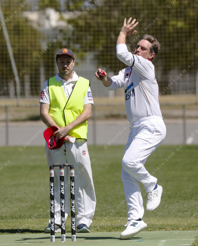 Tasman B grade captain Jamie Fewster on-steps to bowl. (515158_05)