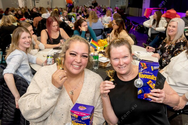 Two Bingo winners with trophies and prizes, Lara (left) and Val (right). 483044_05