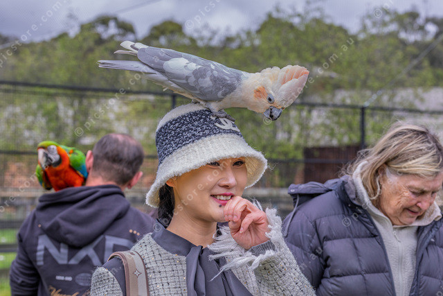 Daisy with a Umbrella Cockatoo X Galah that took a liking to her hat.