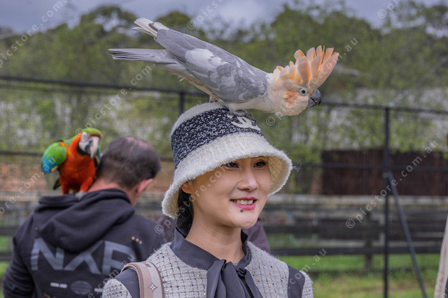 Daisy with a Umbrella Cockatoo X Galah that took a liking to her hat.