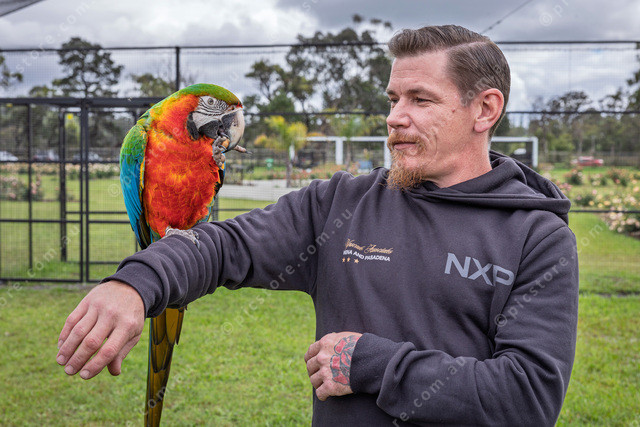 Ben Hamer from Pakenham with a Harlequin Macaw.