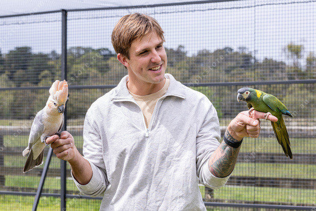 Michael The Bird Guy with L-R Umbrella Cockatoo X Galah and a Lilac Crowned Amazon.