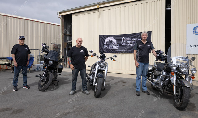 The community is urged to support the Black Dog Ride. Pictured are Ray Baddeley, Port Lincoln Black Dog Ride co-organiser Paul Groen, and Peter Walker with some of the merchandise available including shirts and plushie mascot named Winston. (528500_02)