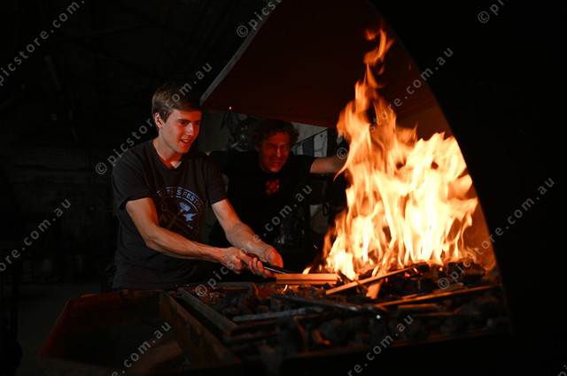 The 2025 Blacksmith Festival in Footscray on May 17-18. Pic of Robbie Alderson (left) and blacksmith AKA Estebanana Kabana (right) who doesn’t want his real name published. Photo by Damjan Janevski. 471177_06