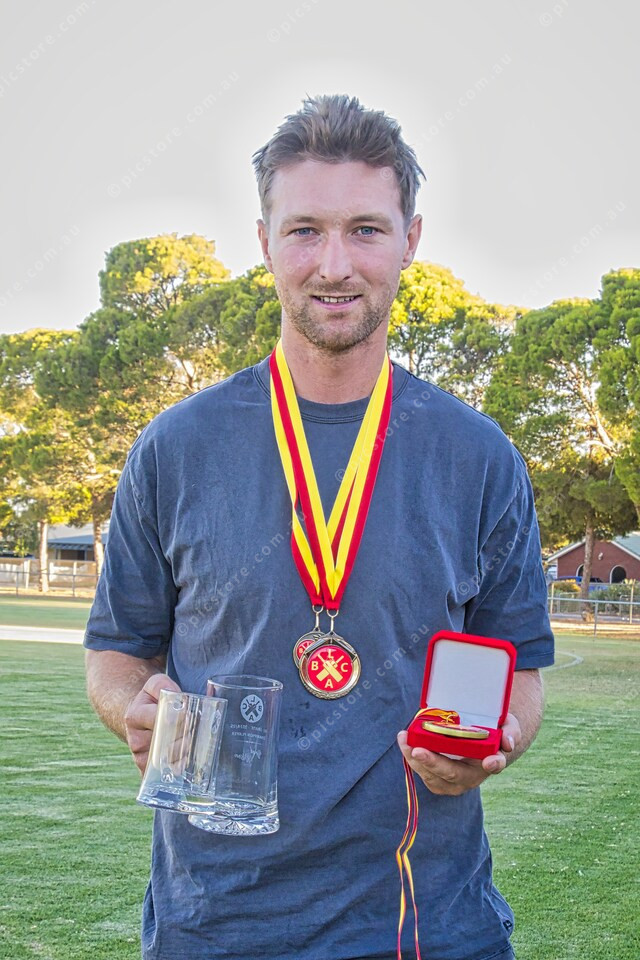 Mallala’s Brad Wilson shows off his silverware after collecting the J.L Mosey Medal, Champion Player and Most A1 Wickets awards. (Michael Slattery: 466910_03)