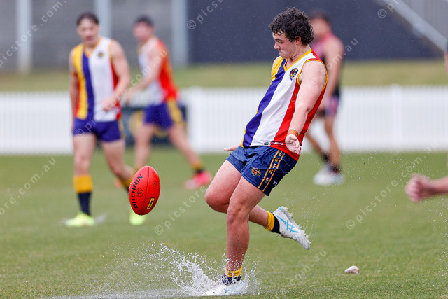 BLG goal-kicker Cade Halliday trudges through a puddle as he goes long. (483342_04)