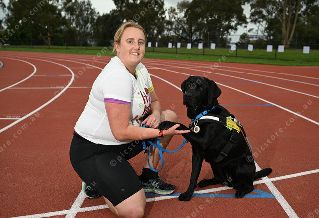 Pic of Casey Hyde and her dog Zeeba. Casey is a top-fundraiser and participant at Vision Australia’s Santa Fun Run event. (Damjan Janevski). 515957_03