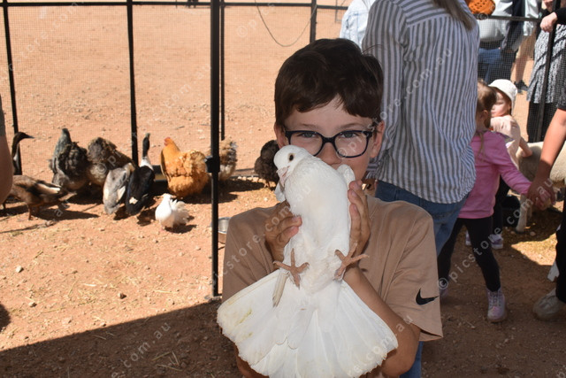 Kaiden R. gets acquainted with a dove in the petting zoo. (506699)