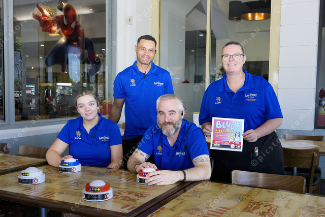 Jordan Burgess, Paul Neyland, Maely Felise (Verde Supervisor) and Natarsha Burgess (Restaurant Manager) prepare for the Bluey Trivia Quiz.