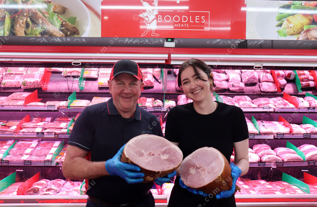 Peter Boodle and CQ Today’s Madelline Pitt with some of Boodles Meats’ famous hams.