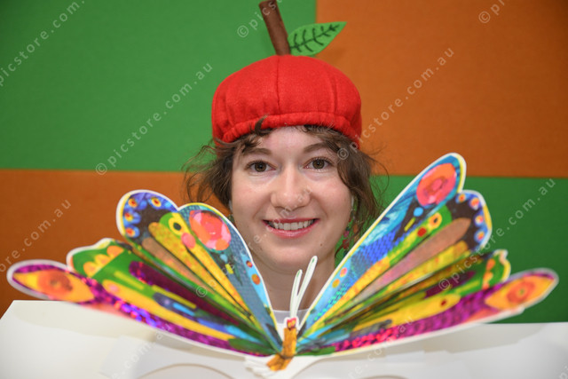 Romsey Library, book week. Pic of librarian Olivia Evans with her favourite children’s book. (Damjan Janevski). 494612_01