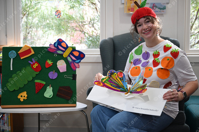 Romsey Library, book week. Pic of librarian Olivia Evans with her favourite children’s book. (Damjan Janevski). 494612_05
