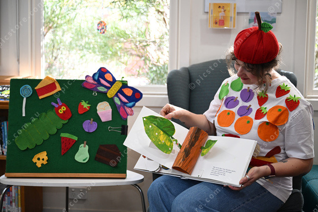 Romsey Library, book week. Pic of librarian Olivia Evans with her favourite children’s book. (Damjan Janevski). 494612_07