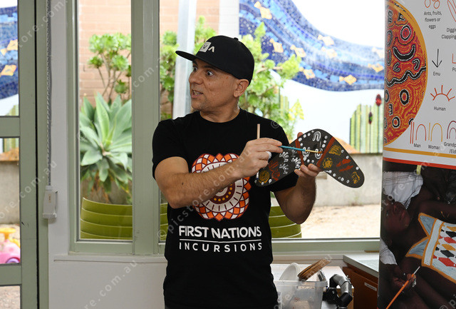 Boomerang painting workshop at Thomastown Library for school holidays. Pic of Sean Czandy from First Nations Incursions. (Damjan Janevski). 489697_01