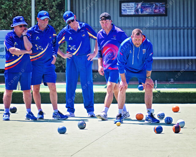 Players watch closely as Darren Gillett’s bowl (brown and orange) enters the head (Ivan Kemp) 512907_10