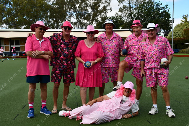 All pretty in pink are Phil Kosch, Ruben Ross, Wendy Kosch, Dean Jenkins, Fred Hardy, Stewart Campbell, and president of the Grangeburn Bowling Club Nettie Ryan.